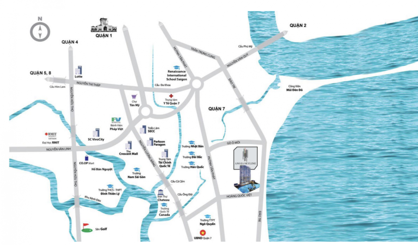 黃金地段:位於胡志明市富順坊黃國越路 89 號。 Skyline 位於第七郡中心,毗鄰富美興,此外還被河流和運河環繞,所有這些都匯集在西貢南部的一個高級生活空間中。