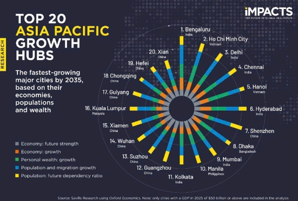 根據Savills對全球245個城市的分析,未來十年的增長將高度集中於亞洲,該地區具備年輕人口結構、快速城市化以及全球製造業轉移等基礎優勢。